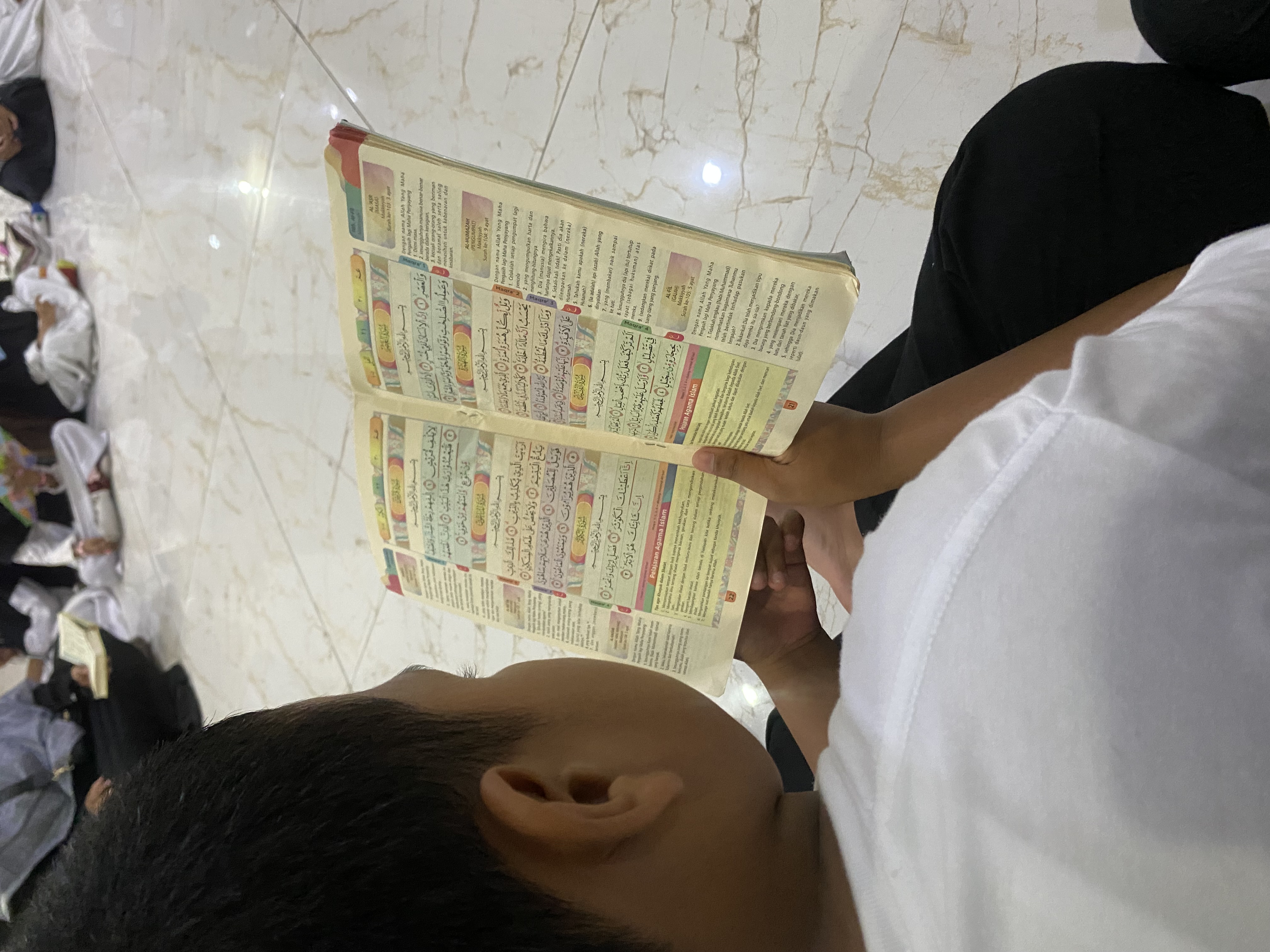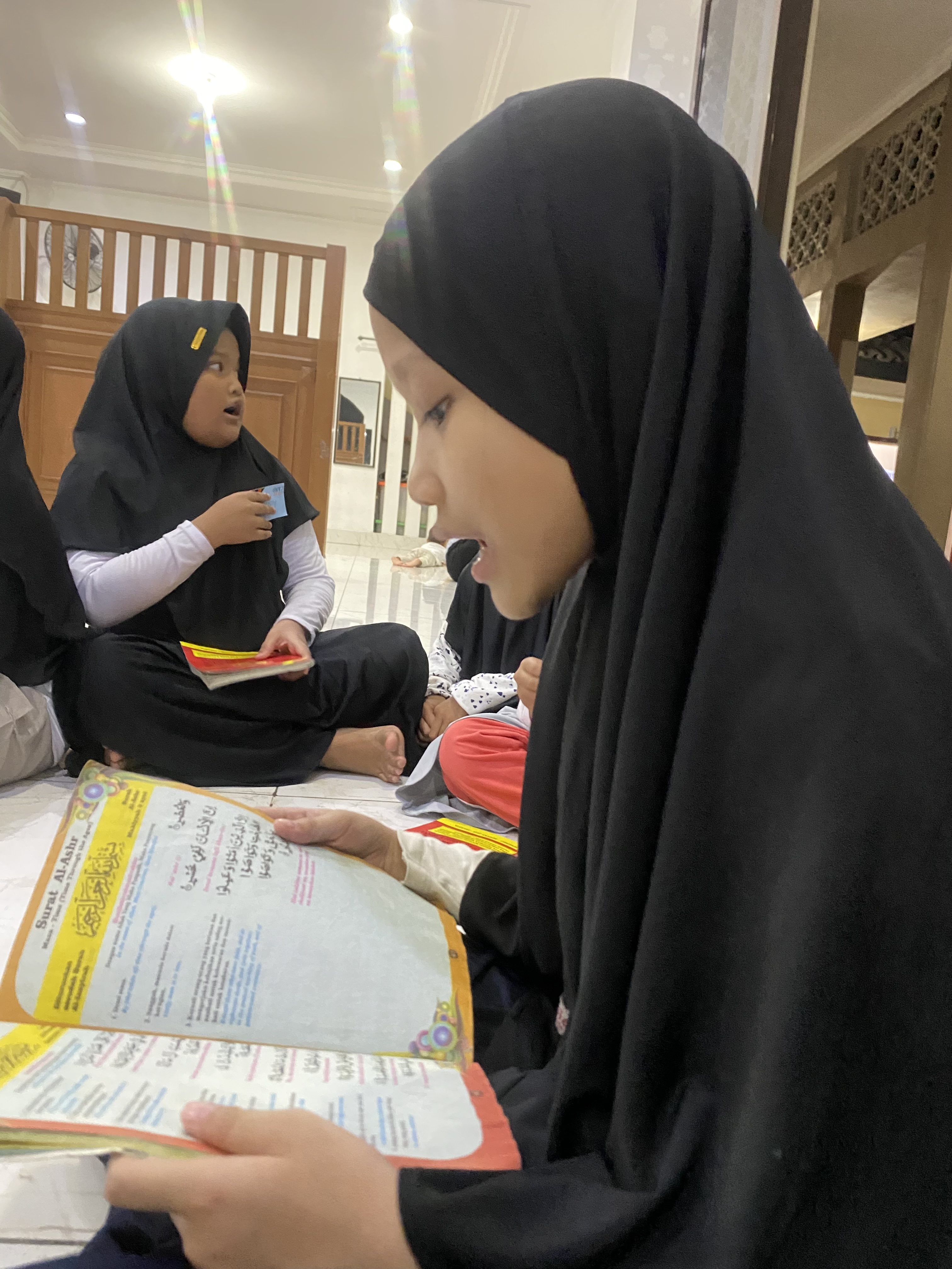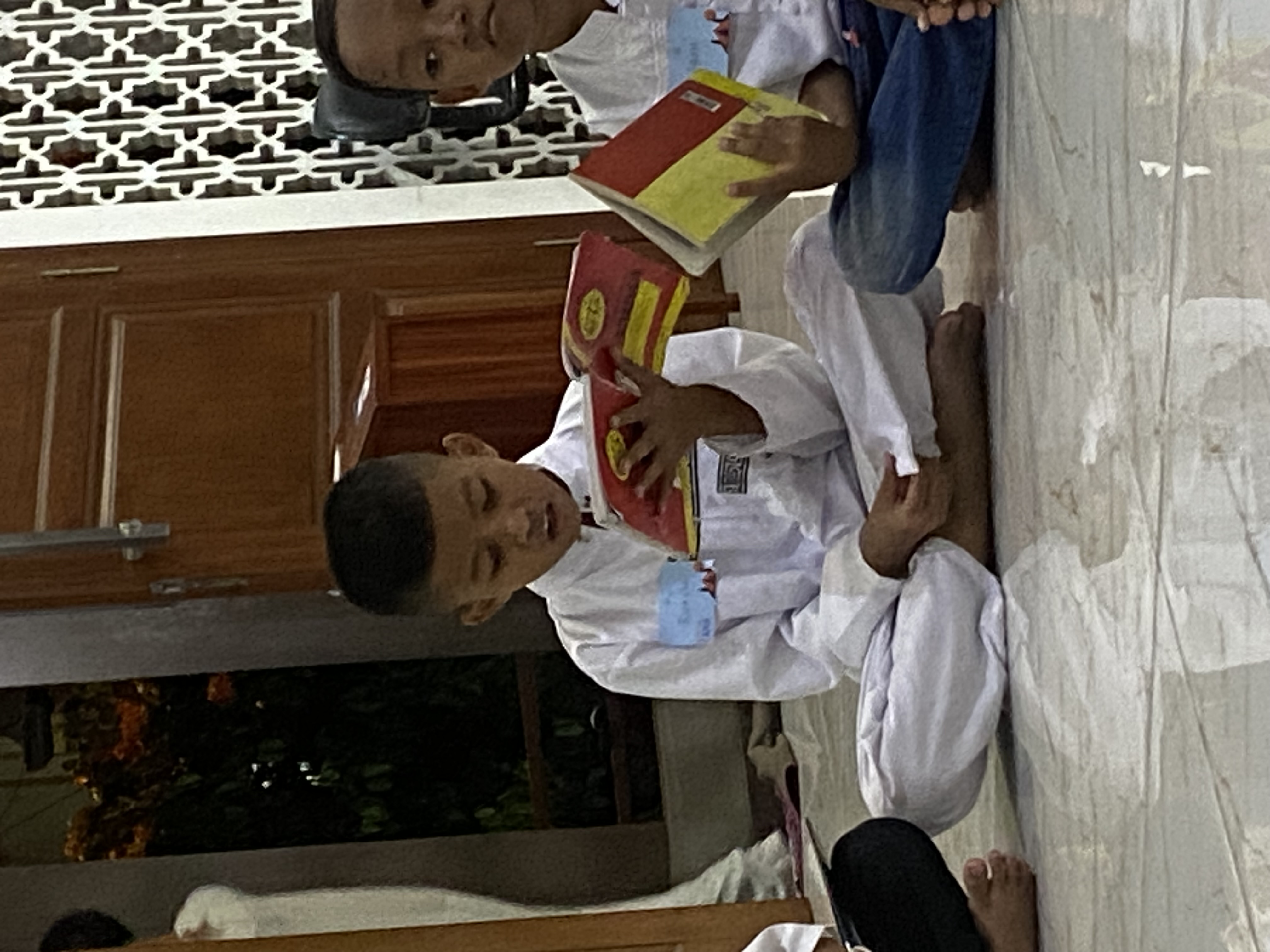 Melantunkan bacaan Al Quran yang sudah dihafal dengan sekali duduk dan disimak oleh para guru dan teman-teman